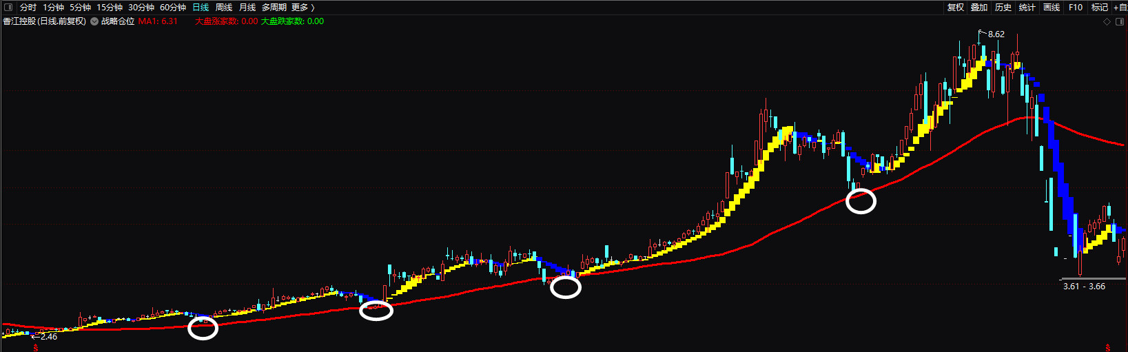K线在红线之上运行仓位可达到5至8成,K线在红线之下运行仓位2成以下,轻松做到顺势加减仓,把被动化为主动