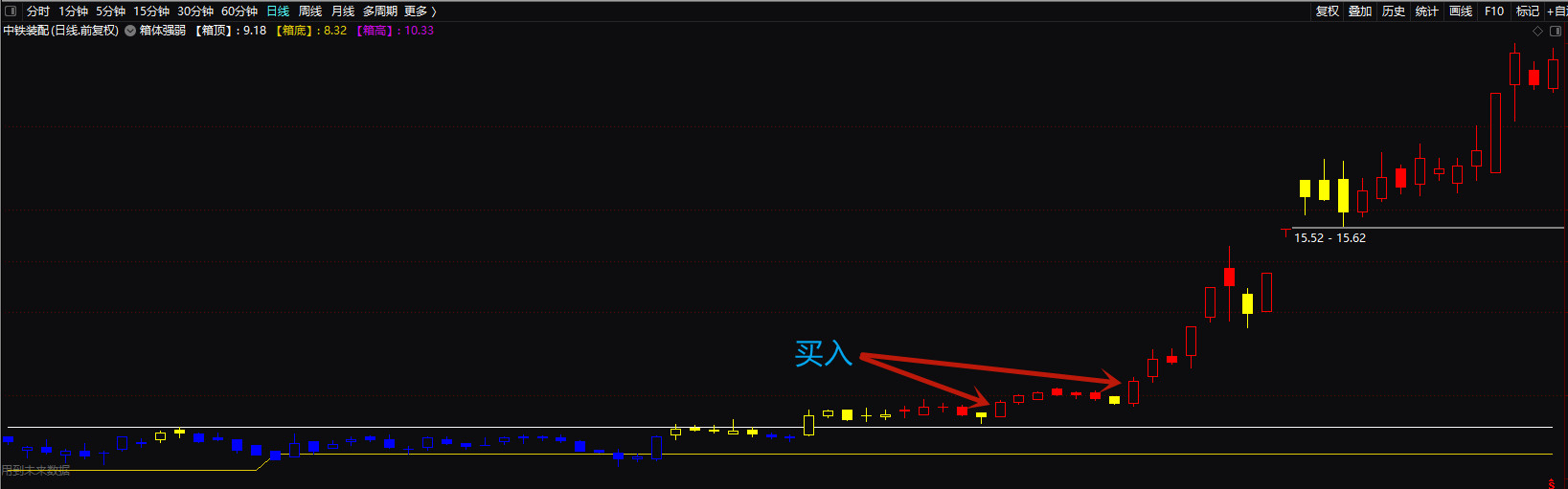 当股价突破箱顶白线,连续几天白线上方运行,K线为红色强势,果断介入,预示着新的上涨大趋势来临